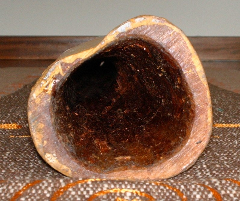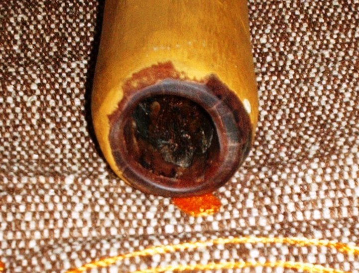 Il mio primo Djalu è lungo 151 cm, l’imboccatura, senza cera, è di forma ovalizzata in altezza ed è larga 2,9 cm e alta 3,1 cm mentre la campana di forma irregolare è larga 7,5 cm e alta 7 cm; le misure dell’imboccatura e della campana sono state prese internamente ovvero la distanza tra le pareti interne.